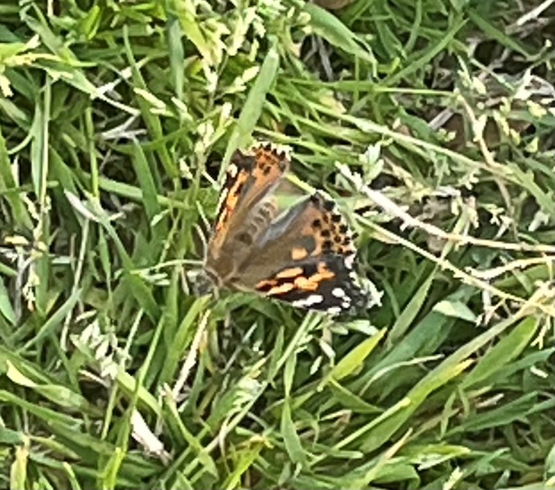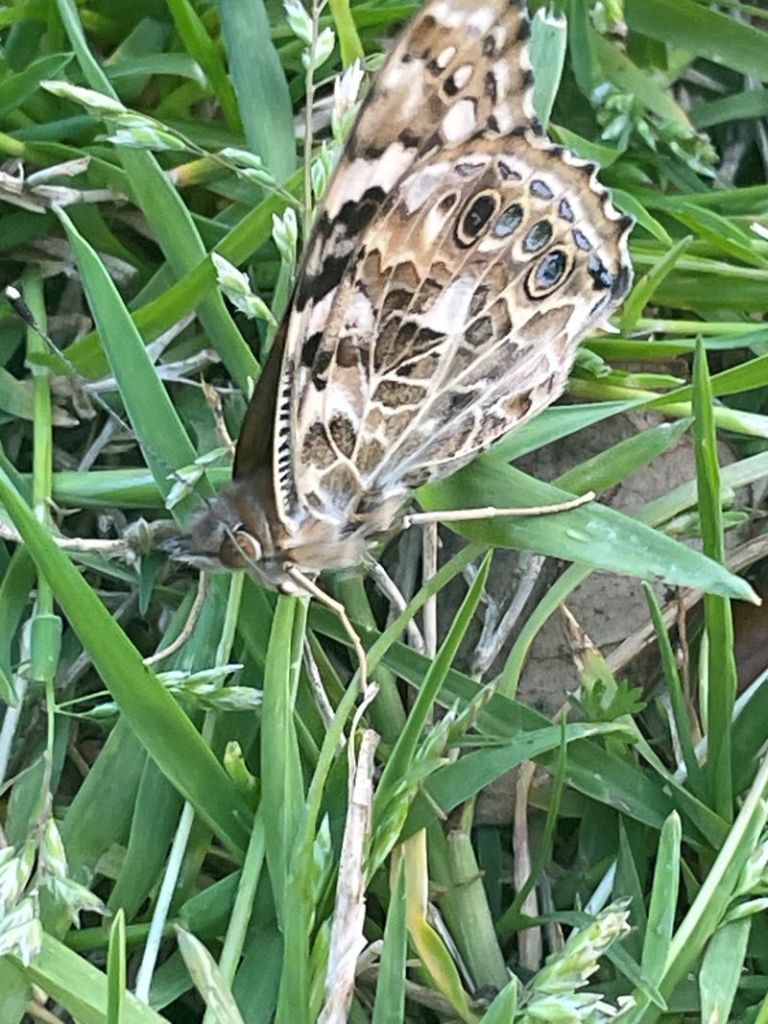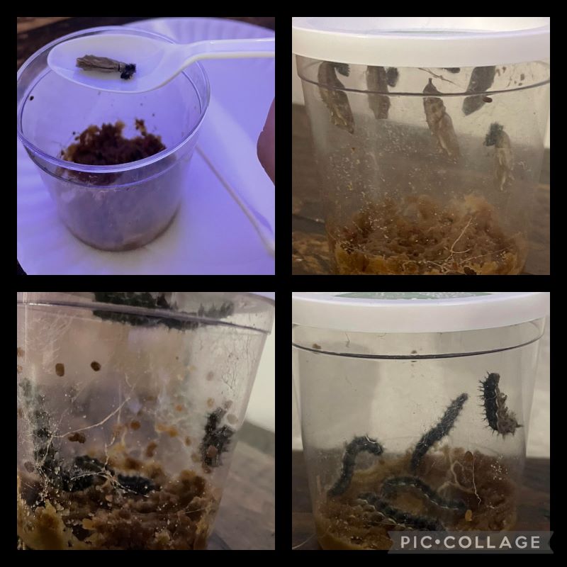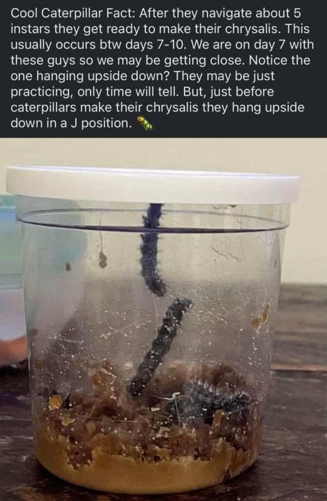 These tiny caterpillars are a sight to behold. They eat nonstop, fueling their rapid growth and transformation. We witnessed them climb to and from the bottom side of the container multiple times to practice hanging upside down. During this time the caterpillar’s goal is to get big and strong enough to make their chrysalis. We got to see them make silk and shed their exoskeletons. Between days seven and ten, they climbed to the top of their container and hung upside down in the shape of the letter J. They made their chrysalides and in another seven-to-ten-day period they began emerging as lovely painted lady butterflies.