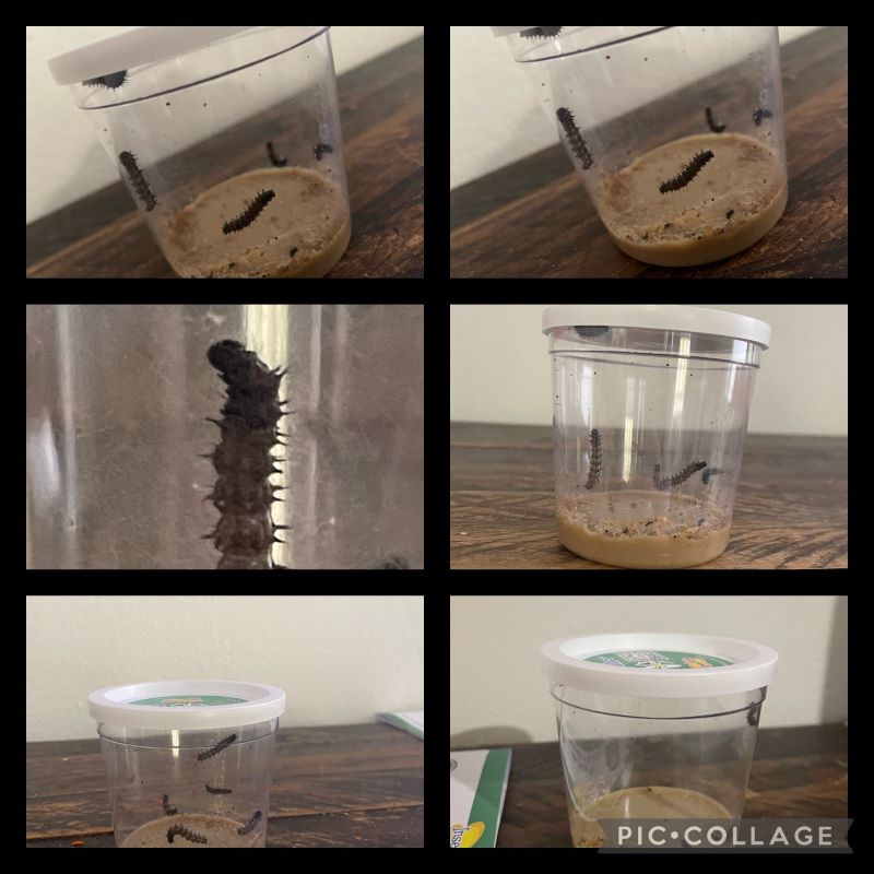 The caterpillars arrive in a plastic container with a lid. The container holds all the food that they need from the caterpillar to the chrysalis stage of development and is clear for optimal observation purposes. The instructions are detailed, with 100% accuracy, about what to expect. There is also a trouble shooting section, which was helpful when one of our chrysalides fell (more on this later).