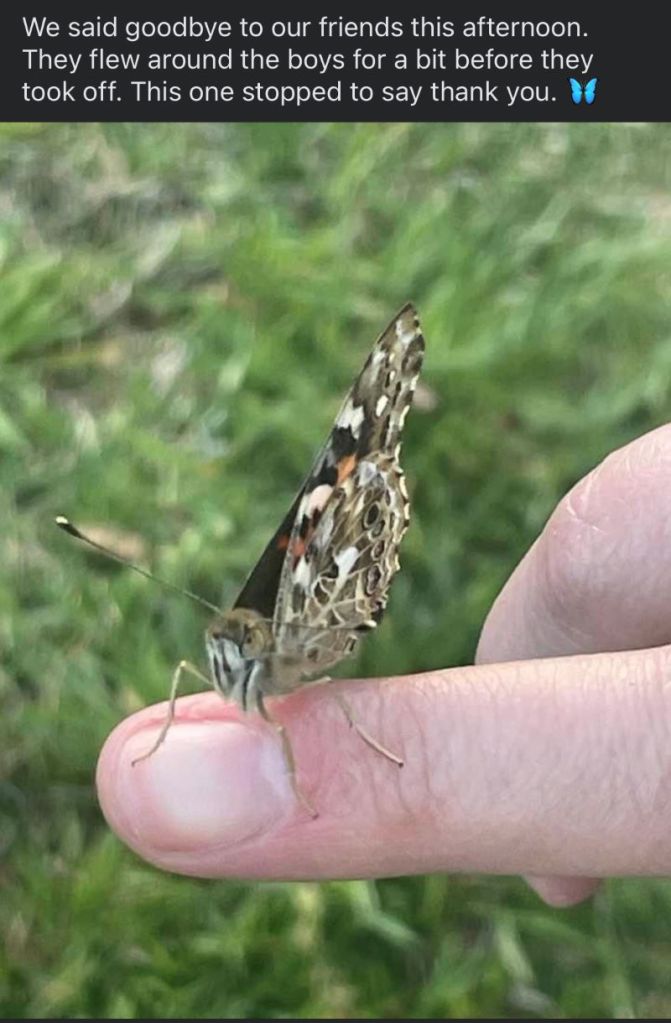 Brief video of releasing the butterflies. The only drawback to the experience was that the mesh enclosure only opened to the middle. This made it tough to help them fly out, but we figured it out. The video doesn’t show but our butterfly besties flew around and landed on us before they flew away.